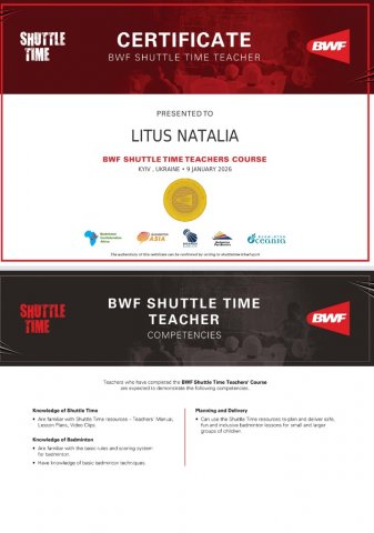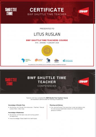 Учасники семінар з бадмінтону "Shuttle Time" 2026 в Києві отримали науково-методичну літературу. В кінці січня прийшло підтвердження від міжнародної програми «Shuttle Time» про вдале проходження семінару нашими викладачами, які отримали підтвердження успішного проходження курсу та отримали український та міжнародний сертифікати.