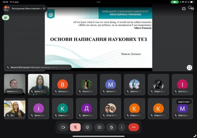 03 квітня 2026 року за організаційної підтримки Наукового товариства факультету відбулася освітня лекція, присвячена особливостям підготовки наукових тез. Спікером заходу виступив Микола Латишев — кандидат наук з фізичного виховання і спорту, доцент кафедри фізичного виховання і педагогіки спорту Київського столичного університету імені Бориса Грінченка.