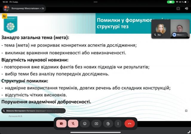 Під час виступу лектор детально розкрив послідовність роботи над тезами — від формулювання теми до логічного оформлення матеріалу. Особливу увагу було приділено практичним аспектам написання, що дало можливість учасникам отримати чітке розуміння структури та змістового наповнення наукових тез.