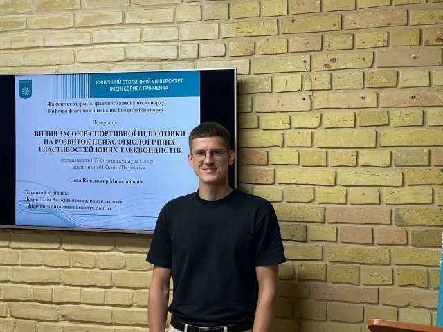 30 липня 2025 року відбулося засідання разової спеціалізованої вченої ради ДФ 26.133.095 Київського столичного університету імені Бориса Грінченка для проведення публічного захисту дисертації Сови Володимира Миколайовича на тему «Вплив засобів спортивної підготовки на розвиток психофізіологічних властивостей юних таеквондистів» на здобуття ступеня доктора філософії з галузі знань 01 Освіта/Педагогіка за спеціальністю 017 Фізична культура і спорт (науковий керівник: Ясько Лілія Володимирівна, кандидат наук з фізичного виховання і спорту, доцент, доцент кафедри фізичного виховання і педагогіки спорту Факультету здоров'я, фізичного виховання і спорту Київського столичного університету імені Бориса Грінченка).