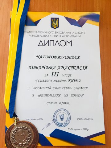 20-26 травня 2019 р. у місті Миколаєві відбулися змагання ХІV літньої Універсіади України з фехтування, на яких Лобачева Анастасія, студентка ІІІ курсу групи ФВб-3-18-2.0д Факультету здоров’я, фізичного виховання і спорту, посіла ІІІ місце у складі команди «Київ -2» з фехтування на шпагах серед жінок. Вітаємо з перемогою!