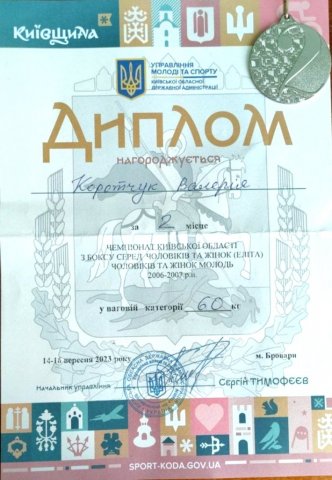 14-16 вересня 2023 року відбулися змагання Чемпіонату Київської області з боксу серед чоловіків та жінок (еліта), чоловіків та жінок молодь 2006 - 2007 р.н. Коротчук Валерія, студентка 1 курсу, освітньої програми "Фізичне виховання" посіла 2 місце у ваговій категорії 60 кг. Вітаємо з призовим місцем і бажаємо подальших успіхів!