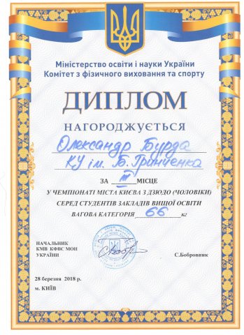 28 березня 2018 року студенти І курсу Бурда Олександр та Гришко Дмитро Київського університету імені Бориса Грінченка взяли участь в Чемпіонаті міста Києва з дзюдо (чоловіки) серед студентів закладів вищої освіти. Змагання проходили на базі спортивного комплексу Національного педагогічного університету імені М.П. Драгоманова.