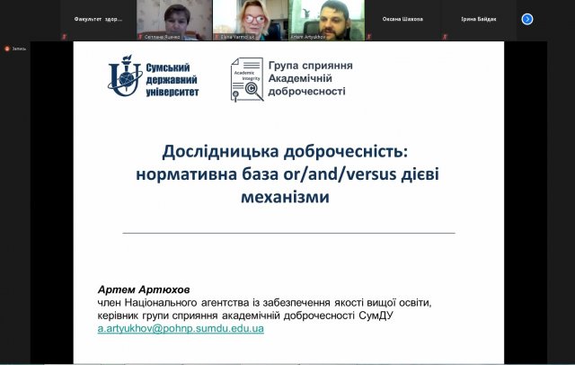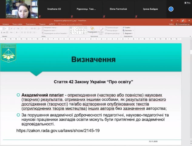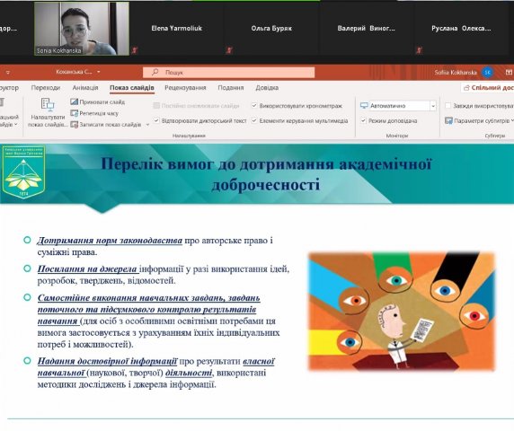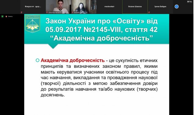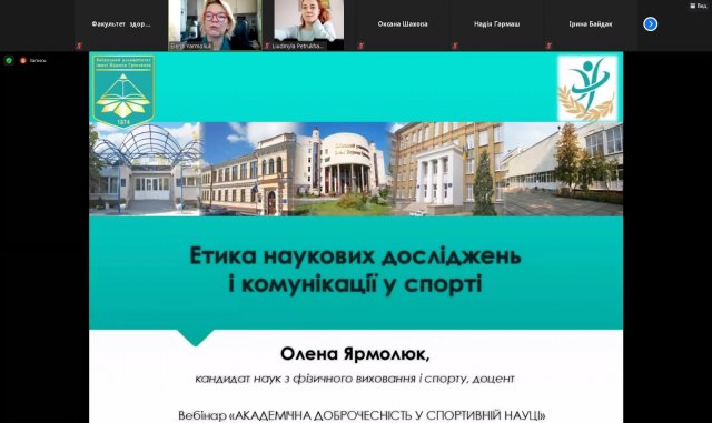 13 листопада 2020 року на Факультеті здоров’я, фізичного виховання і спорту відбувся вебінар «Академічна доброчесність у спортивній науці» для науково-педагогічних працівників закладів вищої освіти, молодих вчених, аспірантів і здобувачів вищої освіти рівня «бакалавр» та «магістр».