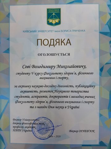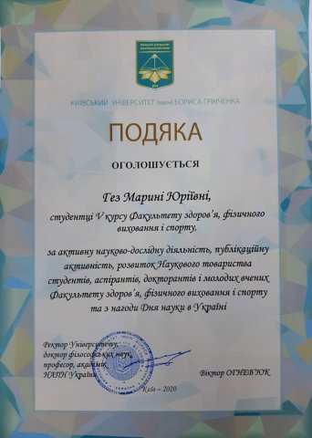 За активну науково-дослідну діяльність та публікаційну активність студентам Факультету здоров’я, фізичного виховання і спорту Гез Марині та Сові Володимиру (група ФВм-1-19-1.4д) оголошено подяку від ректора Київського університету імені Бориса Грінченка! Вітаємо наших студентів!
