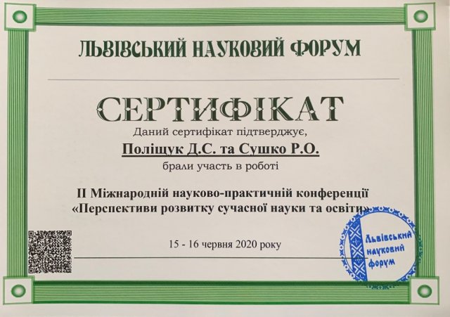 До наукових здобутків студентів у червні 2020 р. додано участь у Міжнародній науковій конференції: Поліщук Д.С., Сушко Р.О. Селекційна робота у провідних футбольних клубах України. ІІ Міжнародна науково-практична конференція «Перспективи розвитку сучасної науки та освіти». Львів, 15-16 червня, 2020. - С. 61-63.