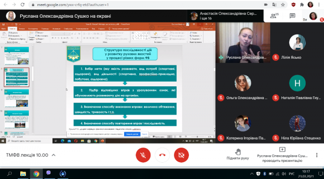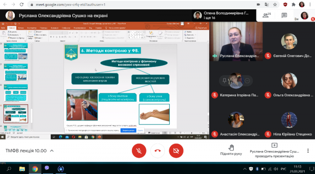 23 березня 2021 р. на кафедрі фізичного виховання і педагогіки спорту відбулася відкрита лекція за темою: "Методи, що застосовуються у фізичному вихованні". Заняття проведено професором кафедри, д.н.ф.в.с., доц. Сушко Русланою Олександрівною в рамках дисципліни "Теорія і методика фізичного виховання" для студентів 2 курсу групи ФВб-1-19-4.0д.