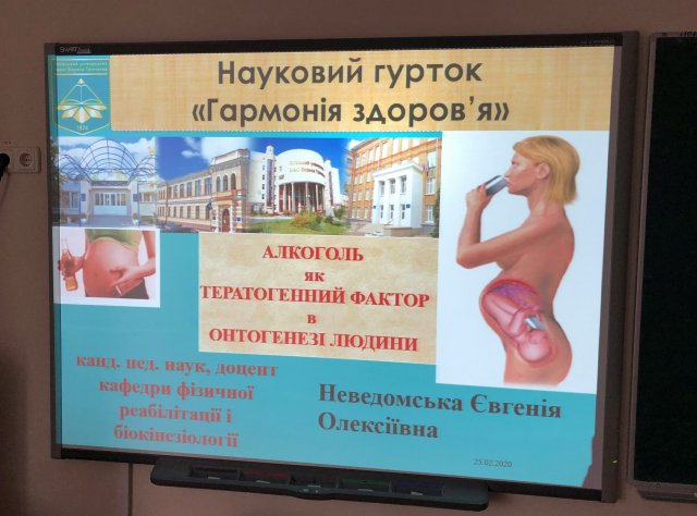 25 лютого 2020 року відбулося засідання студентського наукового гуртка «ГАРМОНІЯ ЗДОРОВ’Я» з теми «Алкоголь як тератогенний фактор в онтогенезі людини» (модератор - Є.О. Неведомська, доцент кафедри фізичної реабілітації та біокінезіології).
