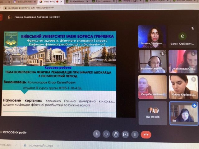У online захисті курсових робіт був задіяний майже весь професорсько-викладацький склад кафедри та студенти групи ФТЕб-1-18-4.0д. Під час проведення захисту курсових робіт було висвітлено актуальні питання комплексної фізичної реабілітації, визначено медико-соціальне значення тих чи інших хвороб, роль Міжнародної класифікації функціонування, обмеження життєдіяльності і здоров’я при відповідному захворюванні, досліджено основні методи та сучасні програми фізичної реабілітації пацієнтів з відповідним захворюванням.