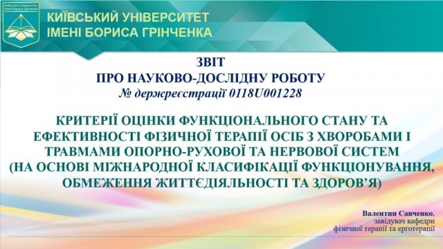 27 квітня 2023 року на засіданні Вченої ради Університету Грінченка затверджено звіт про результати реалізації наукової теми «Критерії оцінки функціонального стану та ефективності фізичної терапії осіб із хворобами і травмами опорно-рухової та нервової систем (на основі Міжнародної класифікації функціонування, обмеження життєдіяльності та здоров’я)» (реєстраційний номер 0118U001228; термін виконання: 2018 – 2023 рр.; керівник теми: В.М. Савченко, доктор медичних наук, професор.