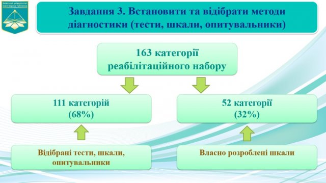 Уніфікована система оцінювання стану здоров’я реабілітантів припускає використання 163 категорій реабілітаційного набору МКФ. Для опису 111 категорій (68%) відібрано 49 тестів, шкал, опитувальників, а для характеристики 52 категорій (32%) розроблено власні шкали оцінювання. Зроблено власний переклад 32 тестів, шкал, опитувальників.