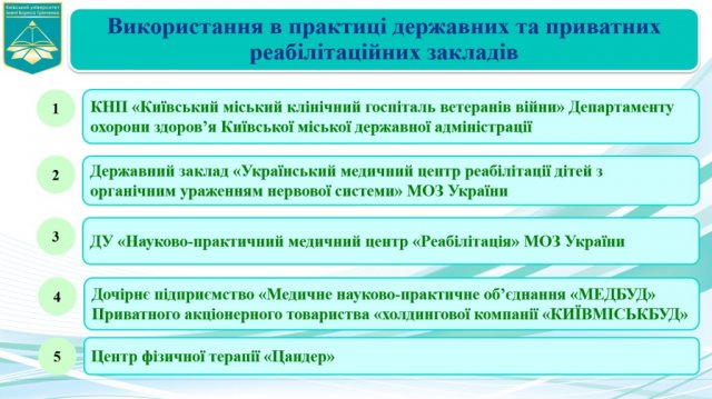 Апробація результатів дослідження здійснена на 8 міжнародних та всеукраїнських науково-практичних конференціях. Результати наукового дослідження використовуються в освітньому процесі кафедр інших університетів, у практиці державних та приватних реабілітаційних закладів.