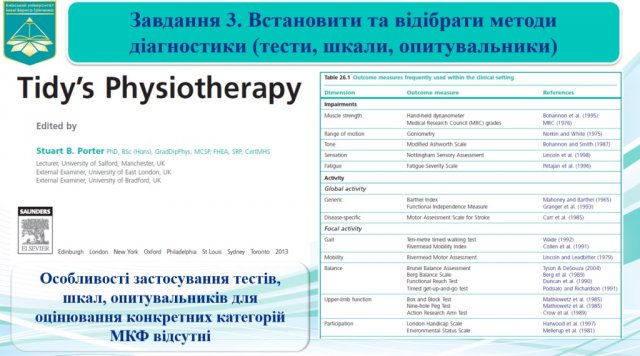 - україномовний опис інструментів оцінювання (тестів, шкал, опитувальників) доменів/категорій МКФ.