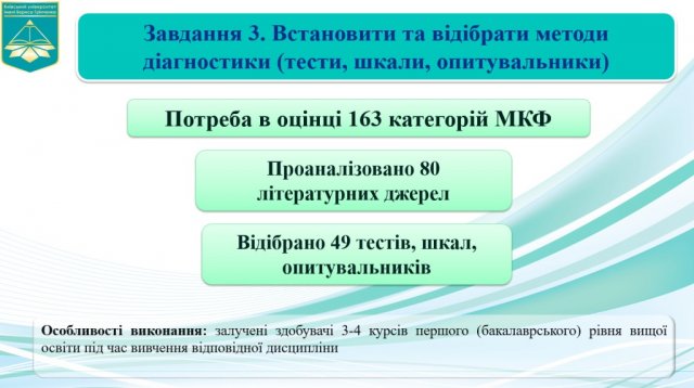 У ході проведеного дослідження командою науково-педагогічних працівників (Савченко В.М., Харченко Г.Д., Омері І.Д., Керестей В.В., Тимчик О.В., Неведомська Є.О., Буряк О.Ю., Погребняк Ю.М., Яценко С.П.) та здобувачів 3-4 курсів першого (бакалаврського) рівня вищої освіти кафедри фізичної терапії та ерготерапії розроблено уніфіковану систему оцінювання стану здоров’я осіб, які потребують реабілітаційної допомоги (реабілітантів). Критеріями оцінки функціонального стану та ефективності фізичної терапії, ерготерапії осіб із хворобами і травмами опорно-рухової та нервової систем слугували домени / категорії Міжнародної класифікації функціонування, обмеження життєдіяльності та здоров’я (МКФ).