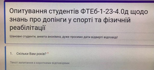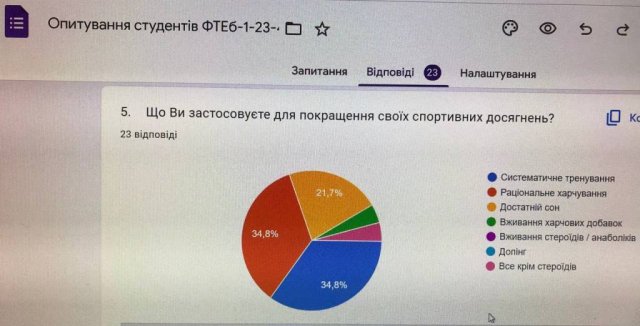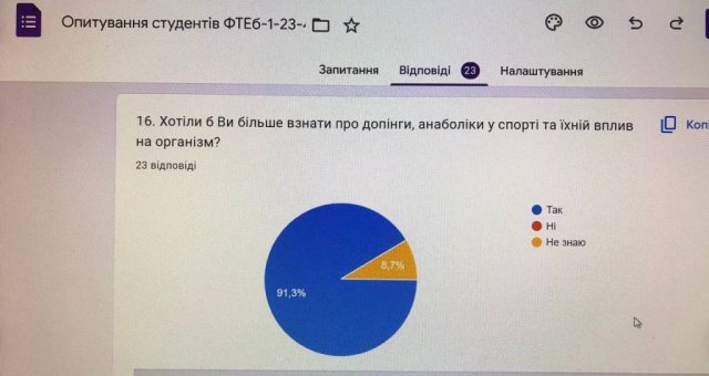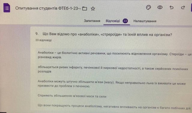 Протягом листопаду 2023 р. студенти-першокурсники Факультету здоров'я, фізичного виховання та спорту пройшли опитування за допомогою Google-форми щодо їхніх знань про покращення спортивних досягнень, про допінги та анаболічні стероїди, зокрема. Метою опитування було виявлення знань першокурсників Факультету здоров'я, фізичного виховання та спорту про власний досвід щодо покращення спортивних досягень, про вплив анаболічних стероїдів на організм та попередження їхнього вживання молодими спортсменами.