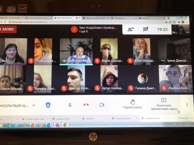 01 грудня 2020 р. для студентів 3 курсу групи ФТЕб-1-18-4.0д проведено консультацію щодо виконання курсової роботи. Під час консультації завідувач кафедри фізичної реабілітації та біокінезіології Савченко Валентин Михайлович розповів алгоритм виконання курсової роботи. Керівники студентських курсових робіт (Харченко Г.Д., Омері І.Д., Тимчик О.В., Неведомська Є.О.) окреслили терміни виконання етапів курсової роботи та відповіли на запитання студентів.