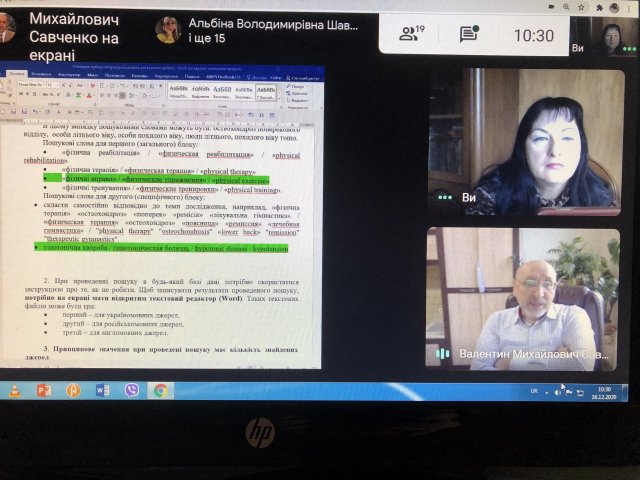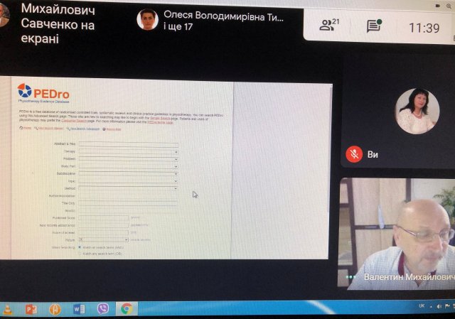 Під час засідання В.М. Савченко, завідувач кафедри фізичної реабілітації та біокінезіології, докт. мед. наук, професор, ознайомив студентів групи ФТЕб-1-18-4.0д – майбутніх фізичних терапевтів / реабілітологів з алгоритмом роботи з електронними базами наукової літератури, зокрема Національної бібліотеки України ім. В.І. Вернадського, Російської наукової електронної бібліотеки «eLibrary», Web of Science, PEDro, PubMed». Студенти апробували запропонований алгоритм.