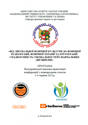 3-4 червня 2021 року викладачі кафедри фізичної реабілітації та біокінезіології взяли участь у Всеукраїнській науково-практичній конференції з міжнародною участю «Від лікувальної фізичної культури до фізичної реабілітації та ерготерапії: спадкоємність спеціальностей і навчальних дисциплін», яку організовано Національним університетом «Запорізька політехніка».