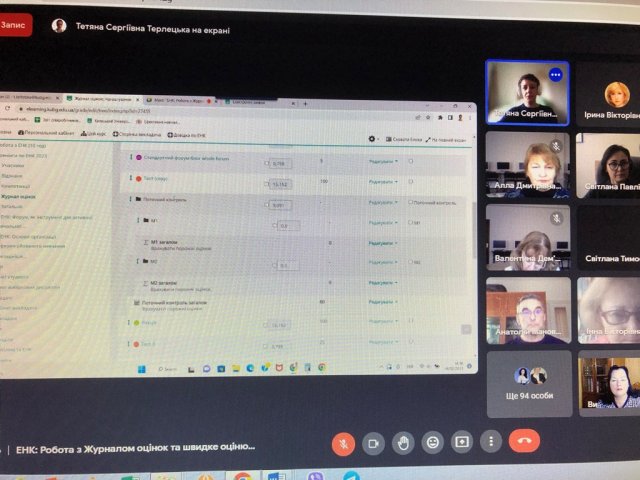 Модератор тренінгу Терлецька Тетяна Сергіївна, молодший науковий співробітник Центру технологій дистанційного навчання, розкрила процедуру  подання заявки на налаштування Журналу оцінок в ЕНК, особливості оцінювання різних видів діяльності, як здійснювати швидке оцінювання виконаних завдань, як згортати види діяльності у модулях, експортувати журнал оцінок, додавати види діяльності та ресурси в ЕНК, а також дала відповіді на багаточисельні запитання присутніх викладачів.