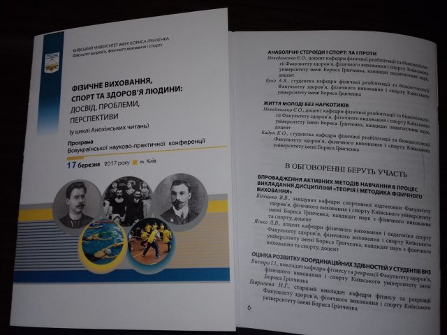 - «Анаболічні стероїди і спорт: за і проти» (Неведомська Є.О., доцент кафедри фізичної реабілітації та біокінезіології Факультету здоров’я, фізичного виховання і спорту Київського університету імені Бориса Грінченка кандидат педагогічних наук, доцент;Буко А. Я., студентка групи ФРб-1-16-4.0д кафедри фізичної реабілітації та біокінезіології Факультету здоров’я, фізичного виховання і спорту Київського університету імені Бориса Грінченка);