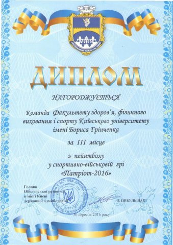 Співробітник кафедри Цикоза Євгенія брала активну участь у спортивно-військовій грі «Патріот-2016» в змаганнях з пейнтболу, що відбулися в с. Нові Петрівці (Київська обл.) за підтримки Оболонської районної в місті Києві державної адміністрації та Громадської спілки «Федерація військово-патріотичного хортингу України».
