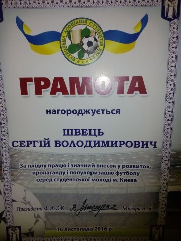 Коли всі питання порядку денного були розглянуті, залишився найприємніший момент. Віце-президент ФФУ Ігор Кочетов від імені Федерації Футболу м. Києва нагородив грамотою Швеця Сергія Володимировича за вагомий внесок у розвиток студентського футболу.