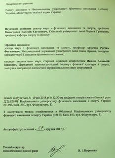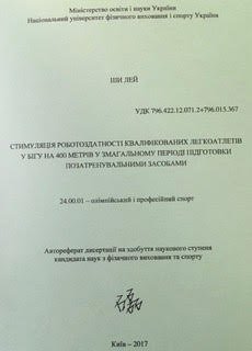 31 січня 2018 р. на базі Національного університету фізичного виховання і спорту України відбувся захист дисертаційної роботи аспіранта Ши Лей на тему "Стимуляція роботоздатності кваліфікованих легкоатлетів у бігу на 400 метрів у змагальному періоді підготовки позатренувальними засобами", науковим керівником якого є професор кафедри спорту та фітнесу Виноградов Валерій Євгенович. Вітаємо Валерія Євгеновича із підготовкою ще одного кандидата наук з фізичного виховання і спорту!