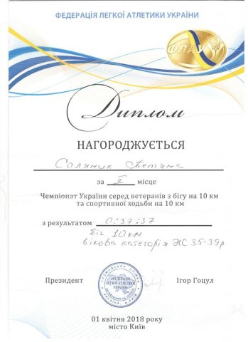 Соляник Тетяна Владиславівна, старший викладач кафедри спорту та фітнесу, посіла 2 місце  у Чемпіонаті України серед ветеранів з бігу на 10 км та спортивної ходьби на 10 км (1 квітня 2018р., м. Одеса). Вітаємо призера Чемпіонату України з легкої атлетики!