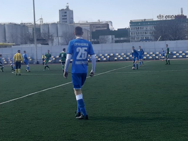 Наша команда з перших хвилин матчу показала атакуючу гру і перший тайм закінчився з рахунком 2:0. Голи забили: Сапоненко Юрій і Никоненко Влад. У другому таймі, як і раніше, м'яч контролювала наша збірна. Злагоджена гра футболістів збірної команди Університету Грінченка привела до перемоги! М'яч побував у воротах суперника 6 разів! У другому таймі відзначились: Миколайюк Євген, Никоненко Влад, Співаков Андрій, Мамчур Влад, Миколайюк Євген, та останній, дебютний м’яч відправив у ворота суперника Приходьхо Олександр!