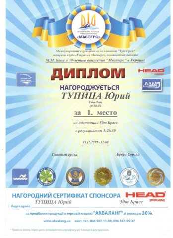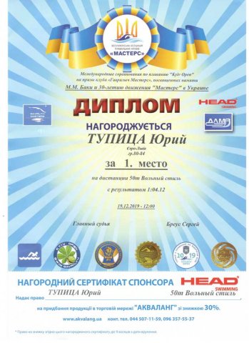 1 місце в категорії 80-84 на дистанції 50 м брас, результат 1,26,30