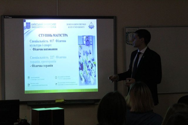 18 лютого 2020 року декан Факультету здоров’я, фізичного виховання і спорту Київського університету імені Бориса Грінченка Лопатенко Георгій Олегович провів профорієнтаційну зустріч зі студентами 4 курсу спеціальності "Фізична культура" Університетського коледжу. Студентам було надано повну інформацію щодо можливостей вступу та навчання на освітніх програмах Факультету.