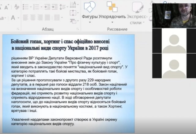 10 квітня 2020 р. старшим викладачем кафедри фізичного виховання і педагогіки спорту Кузорою І.В. зі студентами 2 курсу спеціальності «017 Фізична культура і спорт» (спеціалізація "Захист Вітчизни") проведено дистанційне заняття на платформі Zoom з навчальної дисципліни "Прикладна фізична підготовка і самооборона".