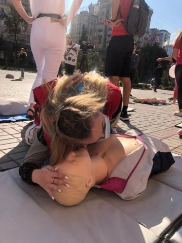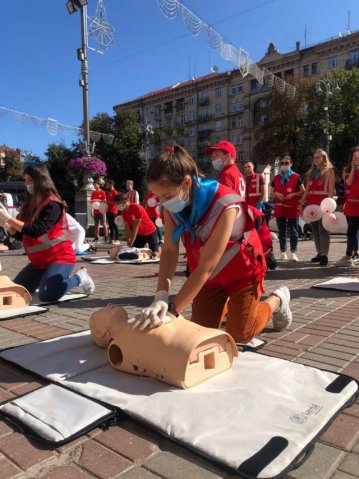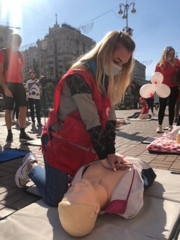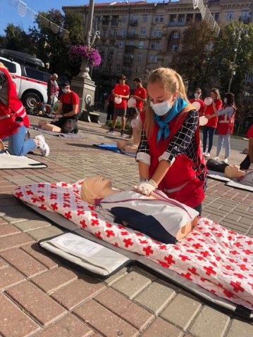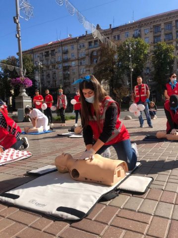 День першої медичної допомоги відзначають у світі 12 вересня. Представники Товариства Червоного Хреста України проводили під стінами КМДА захід під назвою "Адаптація проведення тренінгів із першої допомоги під час пандемії". У центрі столиці зібралося понад пів сотні людей, серед яких були експерти, які давали майстер-клас - це представники Червоного Хреста, патрульної поліції та пожежної служби. Такий захід вони проводять вже в третє. Товариство Червоного Хреста влаштували флешмоб з серцево-легеневої реанімації.