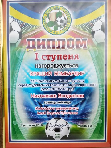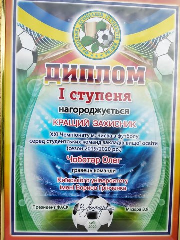 15 жовтня 2020 р. Футбольна Асоціація студентів міста Києва нагородила кращих гравців ХХІ Чемпіонату м. Києва з футболу серед студентських команд ЗВО сезону 2019-2020 р.р.