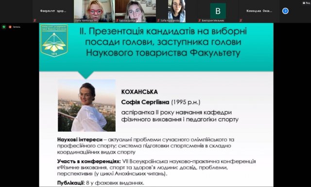 На Зборах було представлено звіт про діяльність Наукового товариства за 2020 рік; обрано голову Наукового товариства - Коханську Софію, аспірантку 2-го року навчання кафедри фізичного виховання і педагогіки спорту, та заступника голови - Яцевського Богдана, студента IV курсу групи ФТЕб-1-17-4.0д. Також відзначено активних членів Наукового товариства Факультету здоров’я, фізичного виховання і спорту та нагороджено дипломами за 3 місце у квесті «Київ – моя столиця: прогулянки містом Бориса Грінченка»: Дзюбу Олександру, студентку 1 курсу групи ФіРб-1-20-4.0д; Клітинську Ларису, студентку 1 курсу групи ФіРб-1-20-4.0д; Гапченко Андрія, студента 1 курсу групи ФТеб-1-20-4.0д.