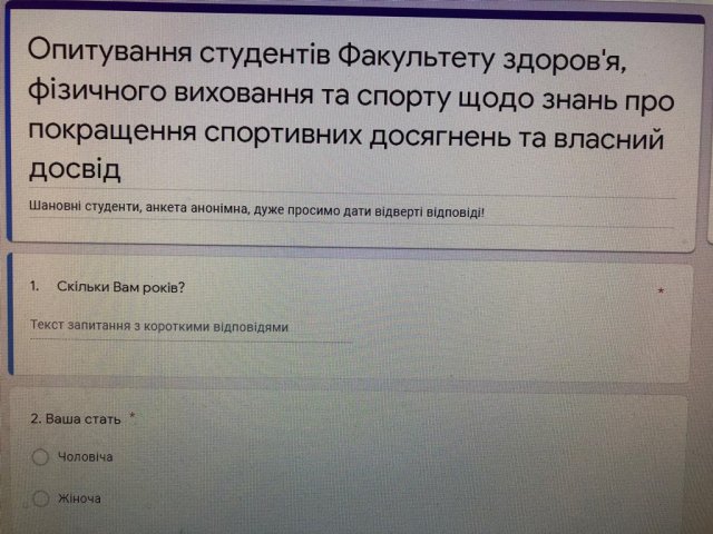 Для студентів Факультету здоров'я, фізичного виховання та спорту в Google-формі створено Опитувальник щодо їхніх знань про покращення спортивних досягнень та власний досвід.