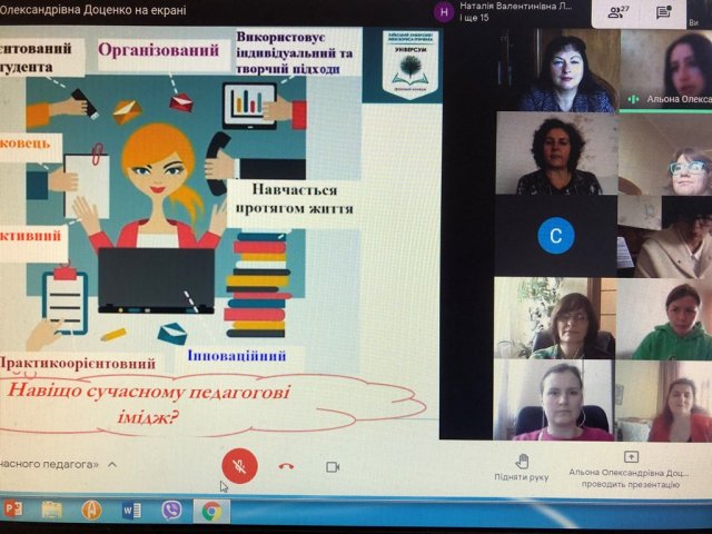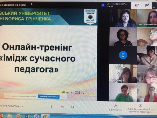 28 квітня 2021 р. викладачі кафедри фізичної реабілітації та біокінезіології Факультету здоров’я, фізичного виховання та спорту взяли участь в онлайн-тренінгу «Імідж сучасного педагога», модератором якого була Альона Олександрівна Доценко, голова циклової комісії з педагогічної освіти Фахового коледжу «Універсум» Київського університету імені Бориса Грінченка.