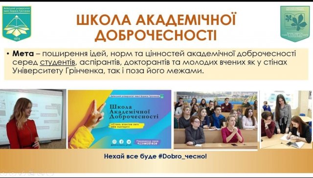 Про основні заходи Школи академічної доброчесності Київського університету імені Бориса Грінченка розповіла координатор Школи та голова Наукового товариства нашого університету Ольга Мусіяченко, викладач циклової комісії суспільних дисциплін і правознавства Фахового коледжу «Універсум» у співавторстві із Ганною Москальчук, спів-координатором Школи академічної доброчесності Університету Грінченка (доповідь «Школа академічної доброчесності: як зробити академічну доброчесність ближчою до студента? »).