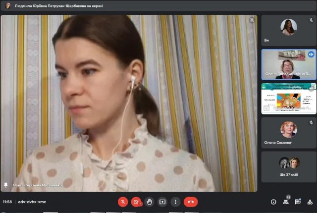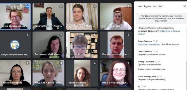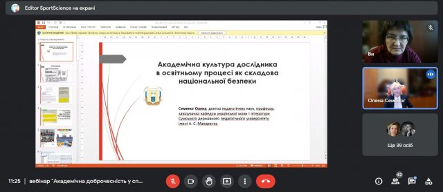 До роботи вебінару долучилася Олена Семеног, доктор педагогічних наук, професор, керівник науково-дослідної лабораторії «Академічна культура дослідника», завідувач кафедри української мови і літератури Сумського державного педагогічного університету імені А. С. Макаренка, яка акцентувала увагу учасників на академічній культурі дослідника в освітньому просторі як складової національної безпеки (доповідь «Академічна культура дослідника в освітньому просторі як складова національної безпеки»).