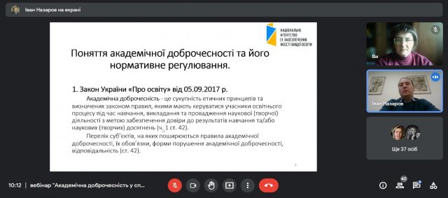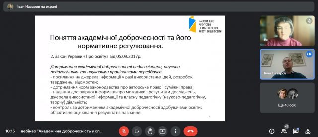 До участі у вебінарі був запрошений Іван Назаров, член Національного агентства із забезпечення якості вищої освіти, доктор юридичних наук, доцент, професор кафедри адвокатури Національного юридичного університету імені Ярослава Мудрого, який представив аналітичну доповідь на тему «Актуальні зміни у законодавстві України в контексті академічної доброчесності».
