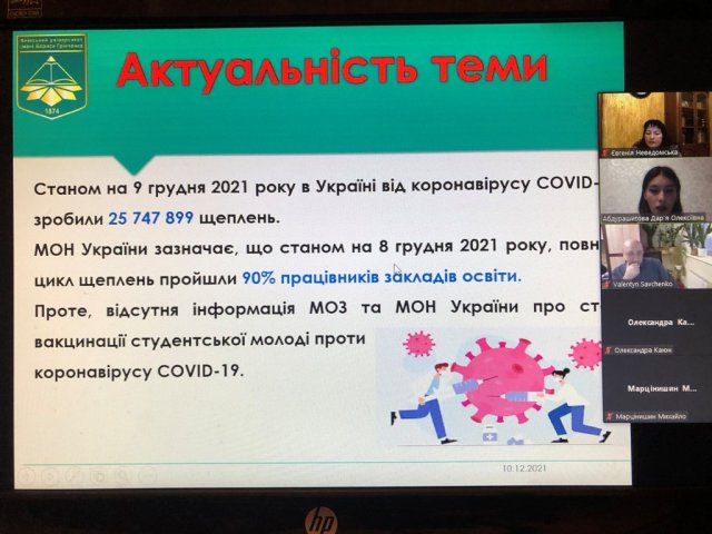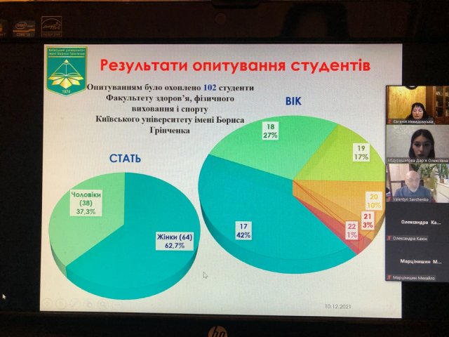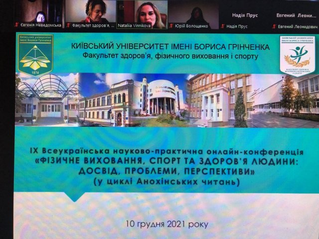 10 грудня 2021 року студенти академічної групи ФТЕб-1-21-4.0д: Тіманова Дар’я, Пуремчук Анастасія, Сілонова Олександра, Абдуашитова Дар’я, які брали участь у науковій роботі гуртка «Гармонія здоров’я» щодо виявлення знань студентів Факультету здоров'я, фізичного виховання та спорту про вакцини та їхнього ставлення до вакцинації в умовах пандемії, спричиненої коронавірусом SARS-CoV-2 за допомогою розробленого Опитувальника в Google-формі виступили на ІX Всеукраїнській науково-практичній онлайн-конференції «Фізичне виховання, спорт та здоров’я людини: досвід, проблеми, перспективи» (у циклі Анохінських читань) з Доповідями під час роботи Секція 3 «Здоров’я людини та сучасні виклики. Фізична реабілітація та ерготерапія»: