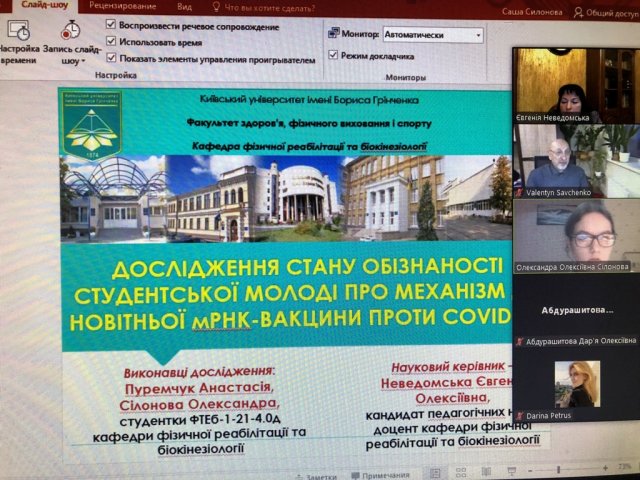 - Стан вакцинації студентської молоді проти Сovid-19 та їхнє ставлення до неї (Дар’я Абдурашитова*, Дар’я Тіманова, студентки групи ФТЕб-1-21-4.0д кафедри фізичної реабілітації та біокінезіології Київського університету імені Бориса Грінченка).