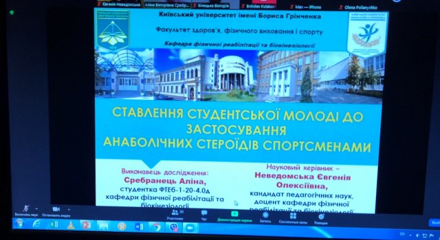 - Ставлення студентської молоді до застосування анаболічних стероїдів спортсменами (Аліна Сребранець*, студентка групи ФТЕб-1-20-4.0д кафедри фізичної реабілітації та біокінезіології Київського університету імені Бориса Грінченка).