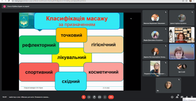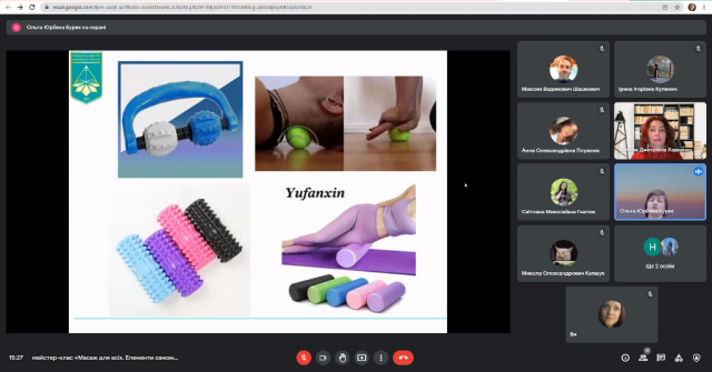 В якості експертів виступили: Харченко Г.Д., кандидат наук з фізичного виховання і спорту, доцент кафедри та Буряк О.Ю., старший викладач кафедри фізичної реабілітації та біокінезіології. Під час майстер-класу учасники згадали історію масажу, ознайомилися із основними техніками самомасажу та ін.