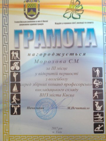 13 березня 2017 Вітаємо з перемогою збірну команду з волейболу! З 31 січня по 2 лютого 2017 року у відкритій першості з волейболу серед збірих команд професорсько-викладацького складу ВНЗ міста Києва наша збірна зайняла III місце. Поздоровляємо переможців та бажаємо подальших успіхів!