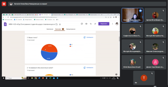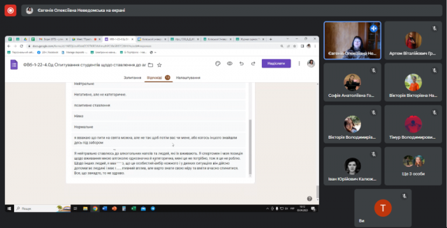 03 квітня 2023 року було узагальнено одержані дані і результати дослідження було подано у вигляді Звіту-презентації для студентів цих академічних груп. Студенти прослухали інформацію про мотиви вживання алкоголю молодими людьми, фізіологічний механізм впливу етанолу на організм та причини виникнення психологічної та фізіологічної залежності від нього.