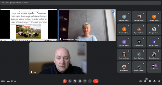 13 квітня 2023 року для студентів 1 курсу спеціальності «Дошкільна освіта» Факультету педагогічної освіти в межах проведення просвітницьких заходів з питань профілактики та попередження нещасних випадків, збереження психічного здоров’я, безпеки життєдіяльності, правил поводження в екстремальних ситуаціях відбувся гостьовий онлайн-тренінг Ірини Дмитрівни Омері, кандидата біологічних наук, доцента кафедри фізичної терапії та ерготерапії Факультету здоров’я, фізичного виховання і спорту на тему: «Збереження психічного здоров’я засобами саморегуляції».