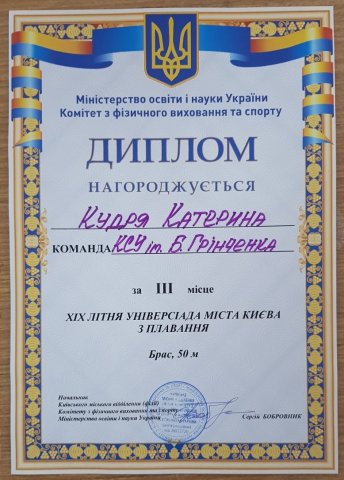Кудря Катерина, студентка магістерської освітньої програми "Тренерська діяльність та спортивна підготовка" (група ТДм-1-23-1.4д), завоювала бронзову нагороду з дисципліни 50 м брасом.