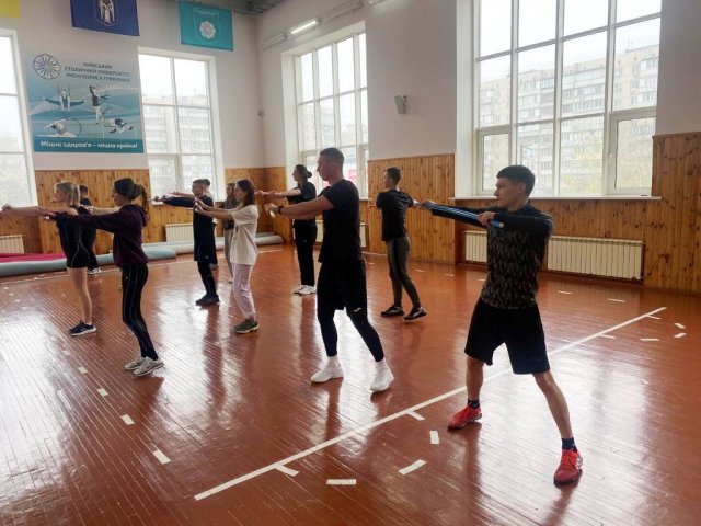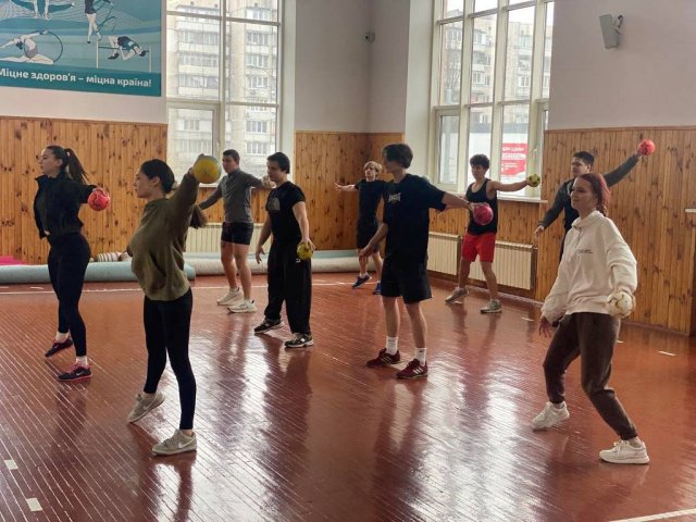 10 квітня 2025 року в рамках навчальної дисципліни «Практикум зі спортивного вдосконалення» під керівництвом Петрової Наталі Вікторівни, старшого викладача кафедри спорту та фітнесу, студенти 2 курсу груп ТДб-1-23-4.0д, ФРб-1-23-4.0д провели для першокурсників ознайомче заняття з аеробіки та конкурс на краще виконання базових кроків аеробіки з предметом (гімнастичною палицею, гімнастичним обручем та м’ячем).