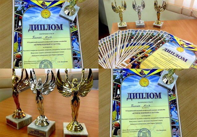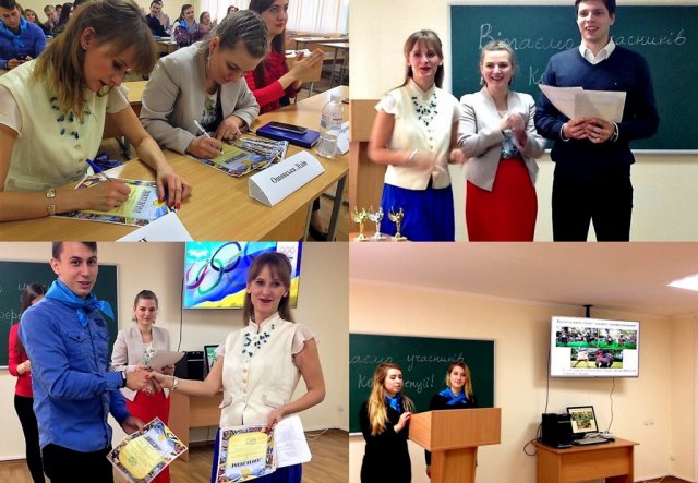 Склад журі: Пальчук Марія Борисівна, кандидат наук з фізичного виховання і спорту, (Національний університет фізичного виховання і спорту України), Тронь Руслан Анатолійович, кандидат наук з фізичного виховання і спорту (Національний університет фізичного виховання і спорту України), Оріховська Анна Сергіївна, аспірантка Національного університету фізичного виховання і спорту України, Ошовська Лідія, студентка ІV курсу спеціальності "Фізичне виховання" Київського університету імені Бориса Грінченка. Всього було представлено 18 доповідей, з яких було визначено переможців: І місце - Тіптюк Юлія, ІІ місце - Симоненко Валерія, ІІІ місце - Маліновська Олеся та Баб'юк Олександра. Бажаємо всім студентам подальшого наукового і творчого натхнення!